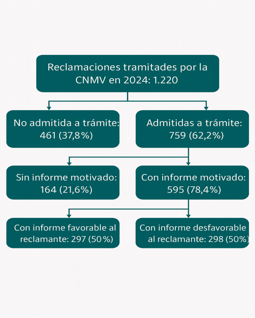 La Comisión Nacional del Mercado de Valores (CNMV) ha publicado su Informe Anual 2024, en el que se destaca la memoria de reclamaciones como uno de los ejes clave del ejercicio. Durante el año, el organismo recibió 1.034 reclamaciones formales y resolvió un total de 1.220 expedientes, incluyendo la resolución de algunas reclamaciones pertenecientes al año anterior 2023. De estos, 759 fueron reclamaciones admitidas a trámite, lo que supone una reducción del 14,3 % respecto al año anterior.